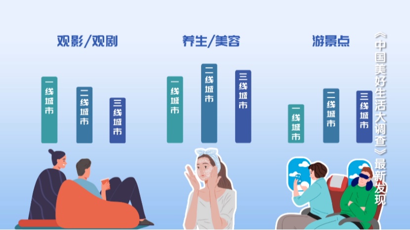 ●二三线城市的人养生、美容,游景点的比例略高于一线城市的人。