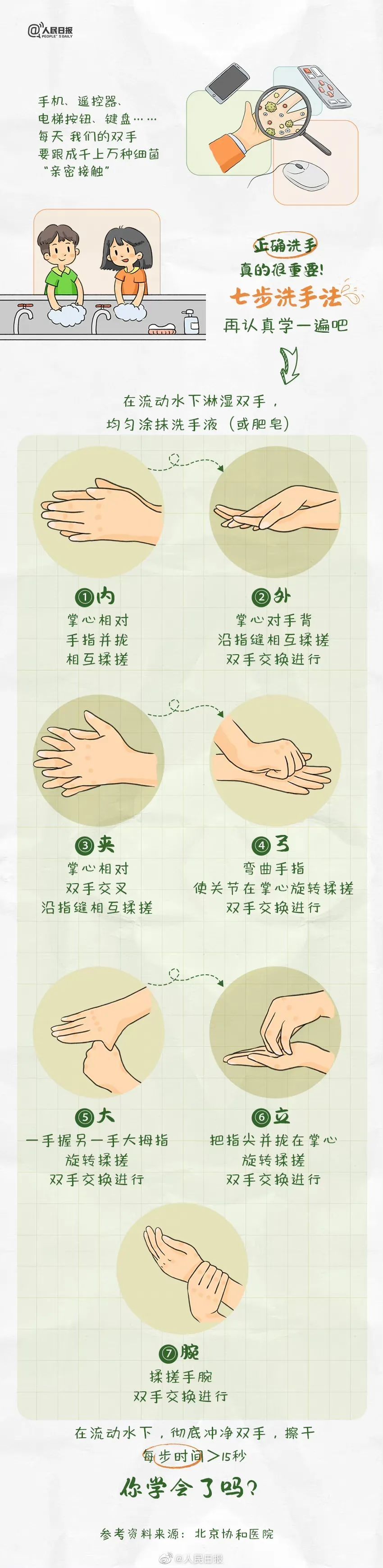 手机、遥控器、电梯按钮、键盘……每天,我们的双手都要跟成千上万种细菌“亲密接触”。正确洗手非常重要!每年5月5日是“世界手卫生日”,这套“七步洗手法”今天再认真学一次。