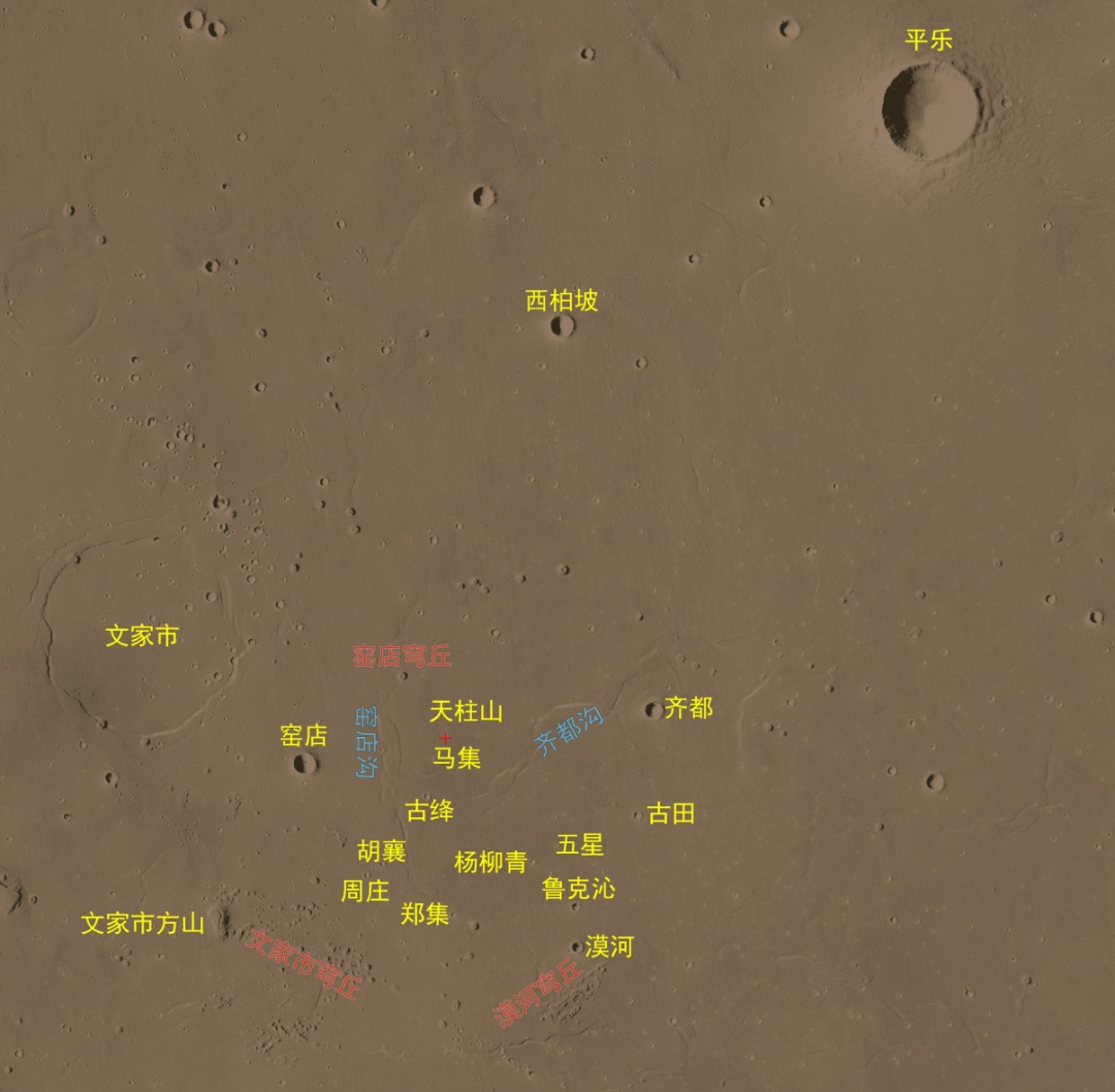 科学研究团队就是通过这些火星高分影像,识别了着陆点附近大量的地理实体。西柏坡、周庄、漠河、杨柳青等“登上”火星,更是将中国标识永久刻印在火星大地上。