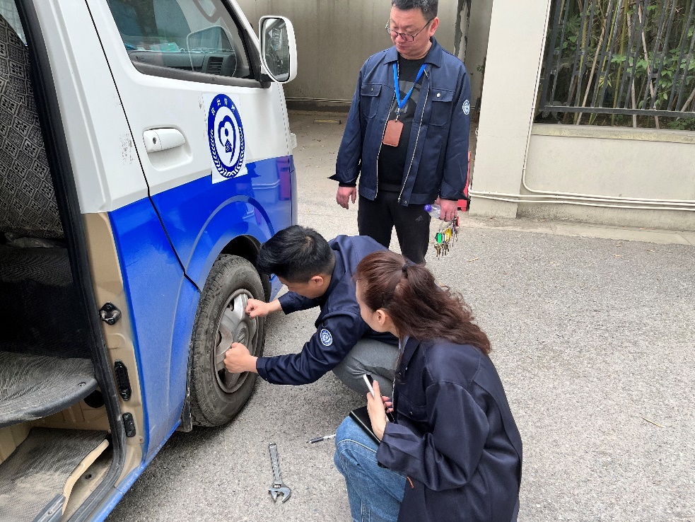 工作人员、驾驶员检查公务车车胎状况