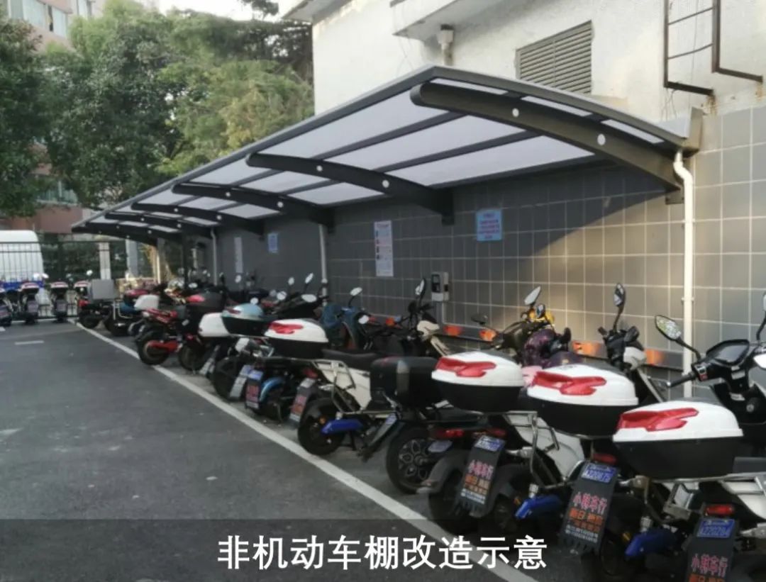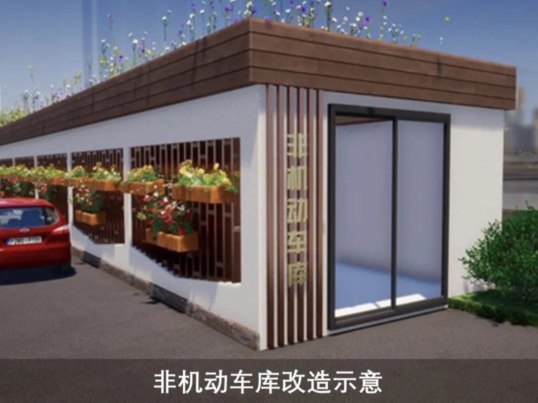改造后,小区的非机动车库将焕然一新——入口改为感应式移门,屋顶新做钢屋架,新做聚碳酸酯屋面板,内墙重新粉刷,外墙改造为水包砂墙面,地面改造为环氧地坪,充电桩换新为智能扫码式充电桩,新增增设烟感报警器、消防喷淋设施、监控摄像头,同时还将进行灯具更换,钢窗换新。