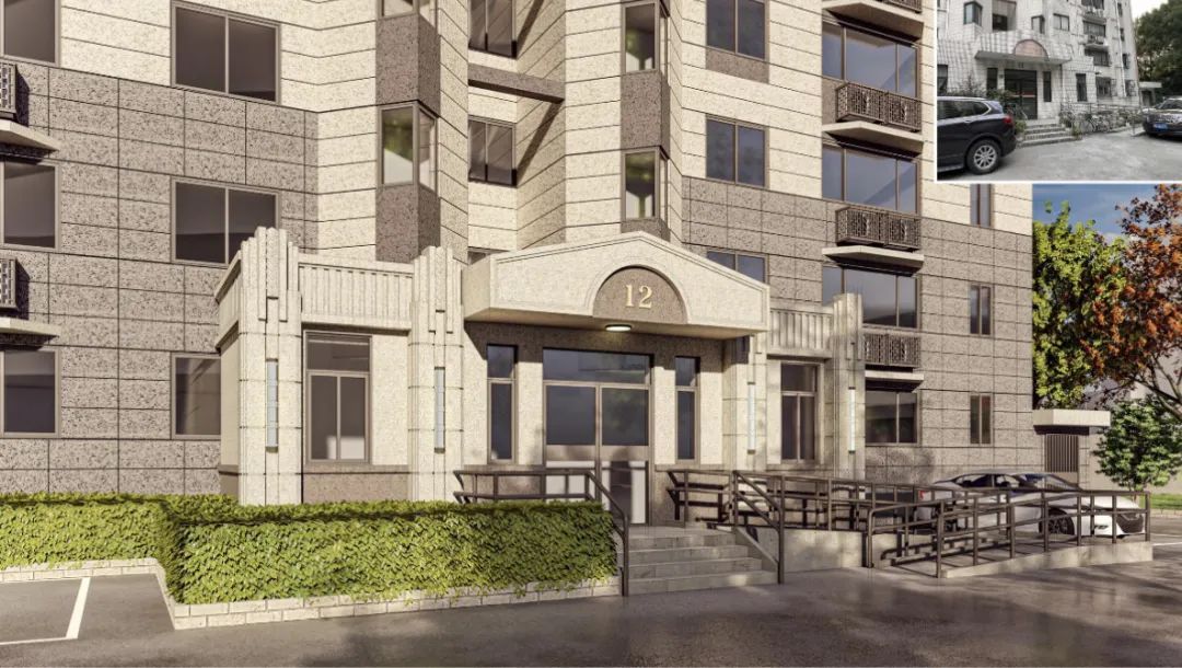 在此过程中,建筑单元门头也将进行整体改造及美化,将更换防盗门、信报箱、栏杆,并做好灯具换新,台阶、坡道修缮,并新增楼牌号。
