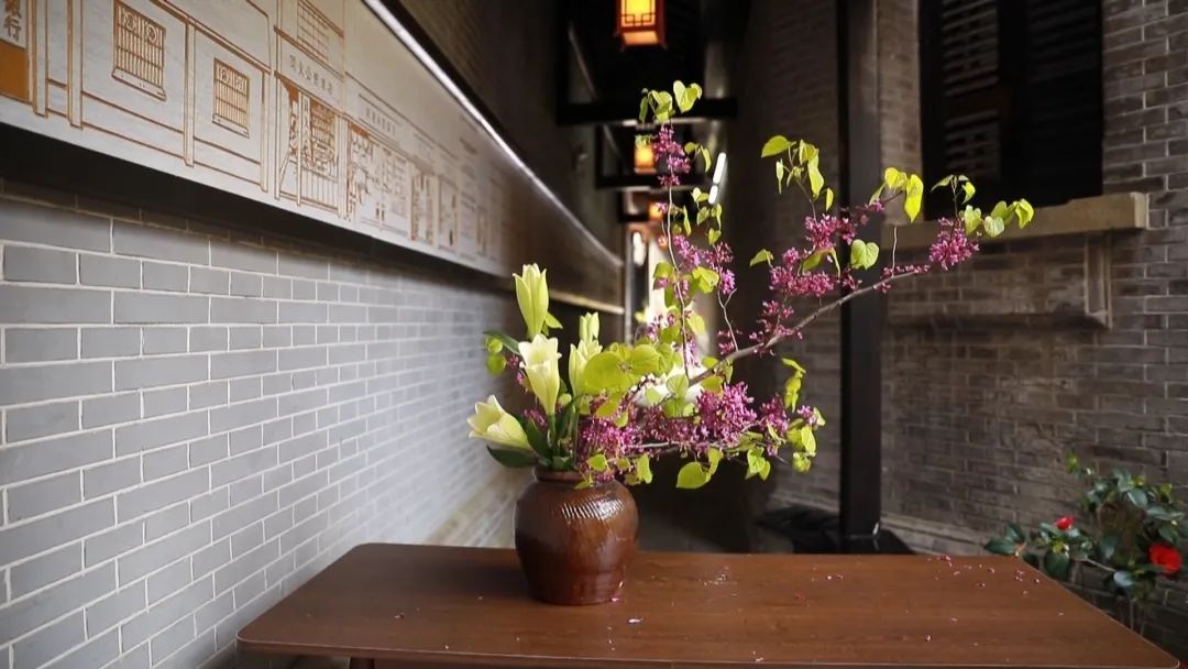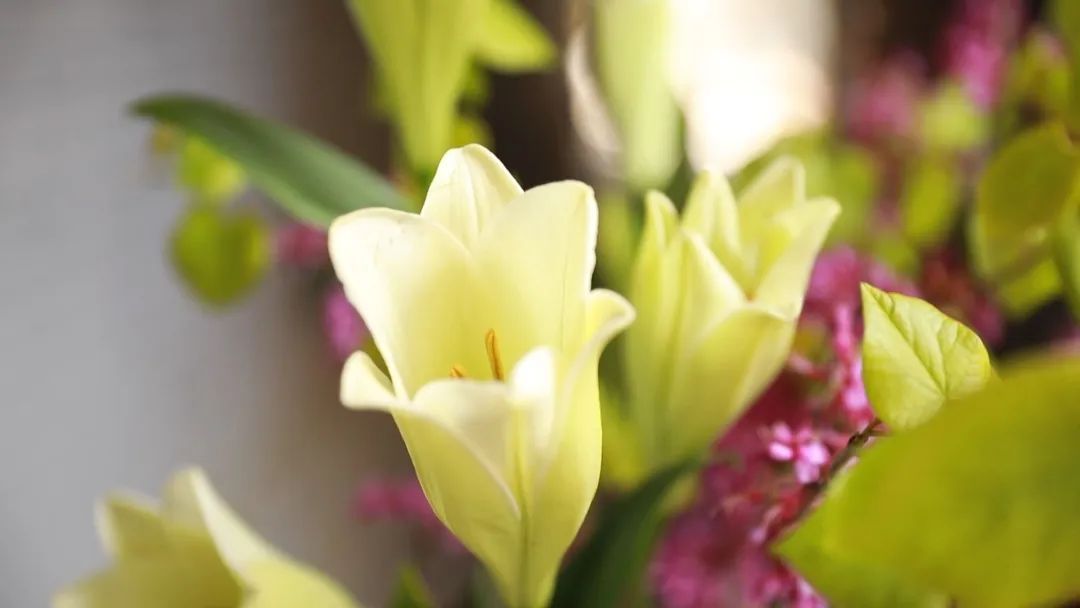在插花时,可以选取主干延伸较长,且花枝较少的紫荆花,让作品更加舒展,再用百合来形成对比,花型上一大一小,花枝上一短一长,花色上一雅一艳。