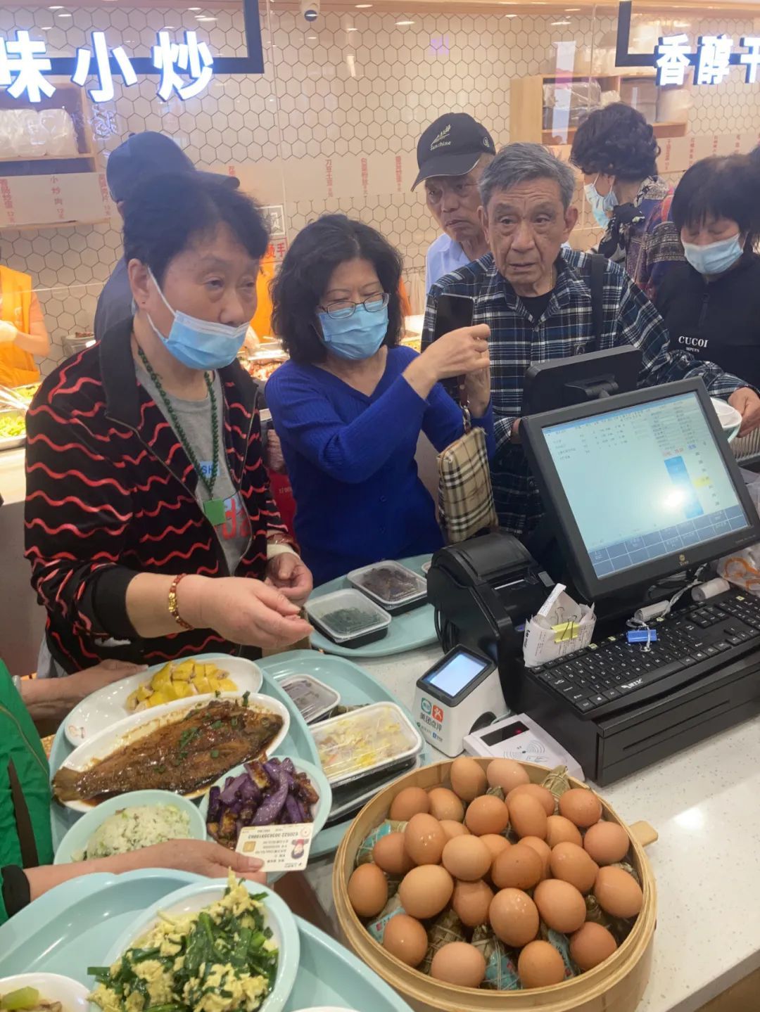 中午11点,熊猫饭堂已经排起了队。顾客可以凭老年卡,免费领一颗“立夏蛋”和一个红豆馅荷叶粽。