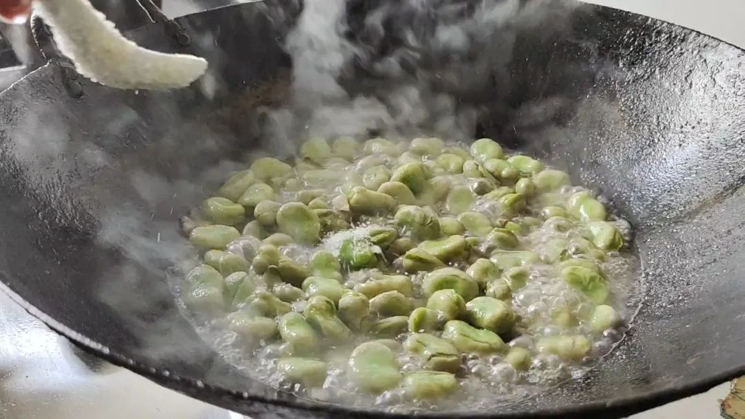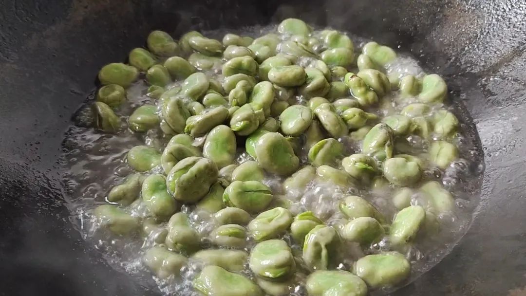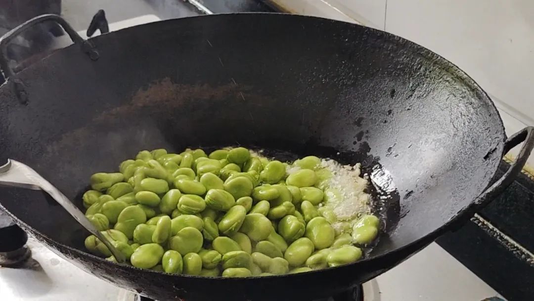 将蚕豆下锅翻炒