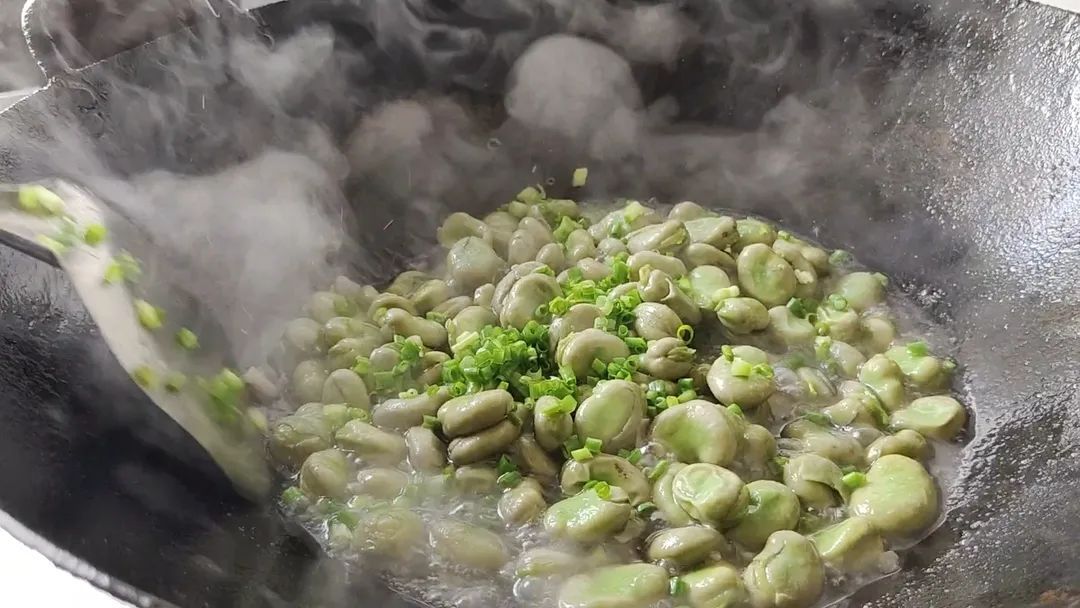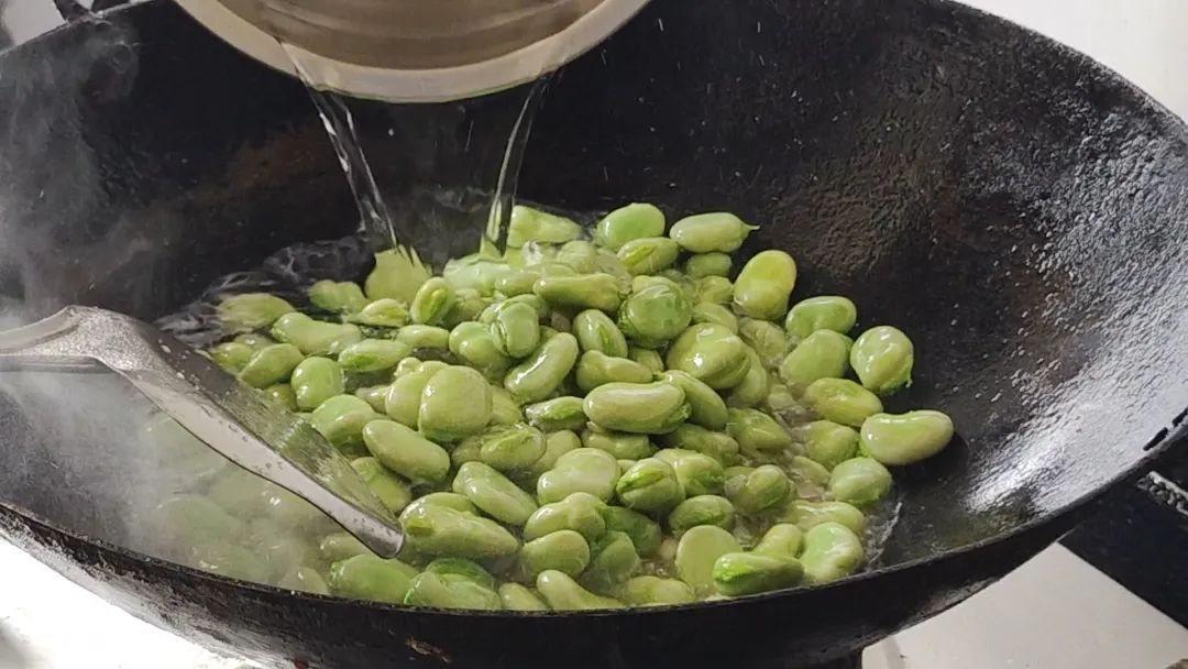 炒出蚕豆的清香味后,加入清水漫过食材