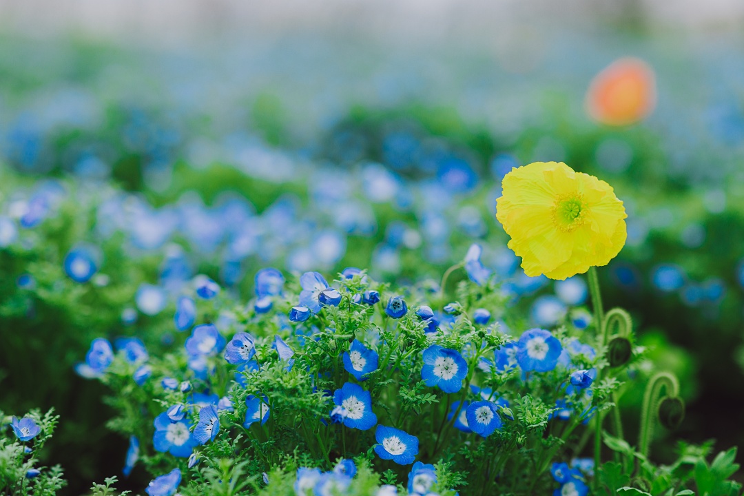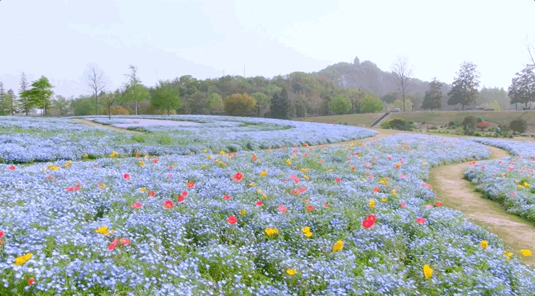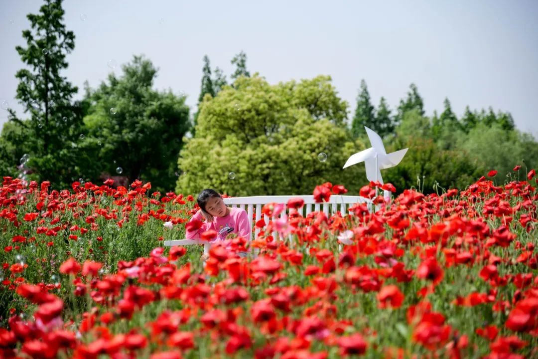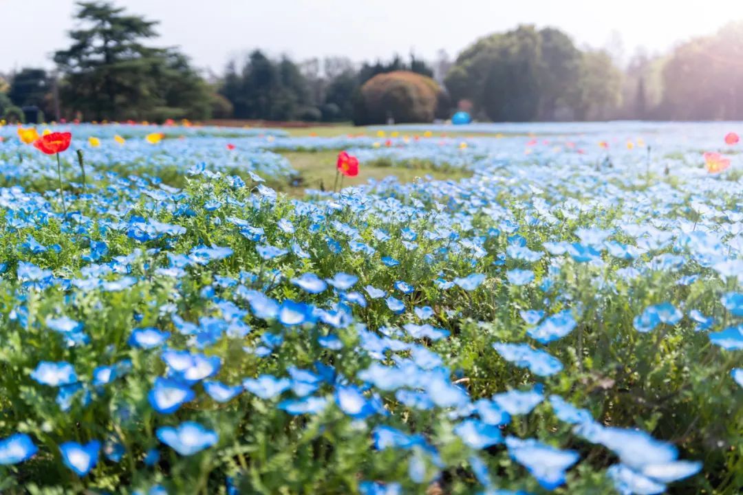 走入滨江森林公园的环园东大道,两侧草坪的喜林草正在绽放,仿佛自己坠入了一个油画世界,连成片的淡蓝色喜林草盛情开放。娇艳多姿的虞美人点缀在其中,组成绚丽花海,唯美又清新。