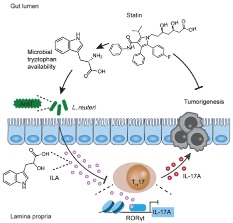 该研究首次揭示了肠道微生物群是他汀类药物化学预防的基础,证明了罗伊氏乳杆菌-吲哚-3-乳酸-TH17轴在结直肠癌发生过程中的作用,并提出可使用单一共生菌或其代谢产物作为目前结直肠癌预防策略的补充,为结直肠癌的化学预防奠定了新的思路。