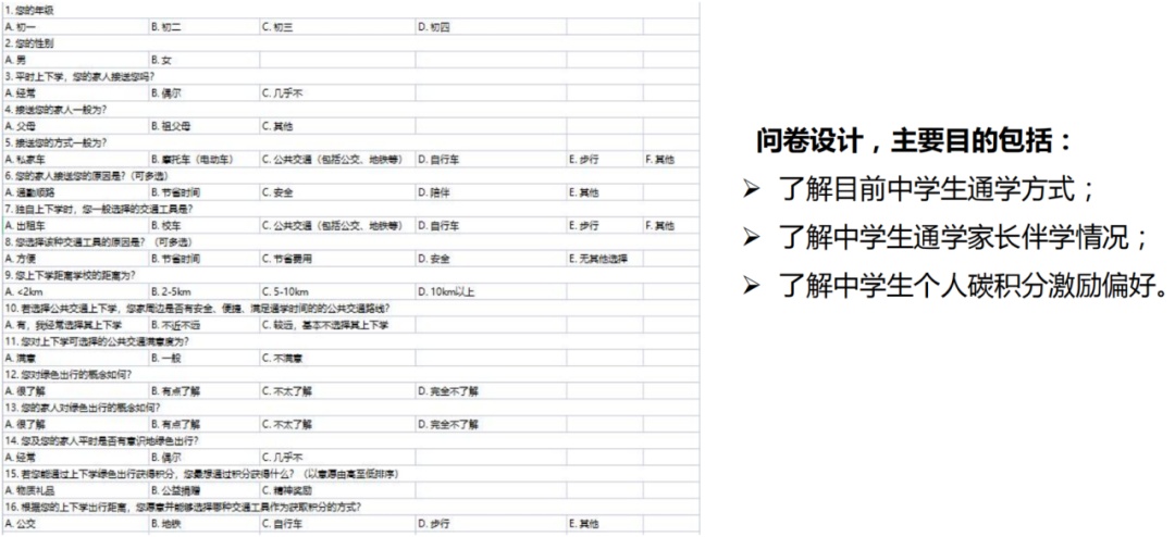 本项目以中学生群体为研究对象,通过分析家长伴送下的中学生群体出行行为特征,将影响通学行为的因素分为中学生个人因素、家庭因素和出行方式因素,提出了一种新的“碳积分”的激励机制,旨在引导中学生和家长们通过低碳的出行方式进行通学。