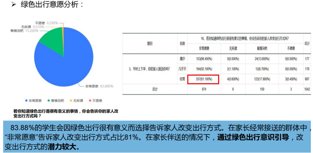 在家长经常接送上下学的群体中,81%的学生在已知绿色出行有意义后,会告诉家长改变出行方式,因此,绿色出行意识的引导,会产生较大的减排潜力。
