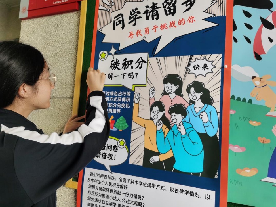 项目组成员设计了低碳出行的海报,在学校宣传栏进行张贴。