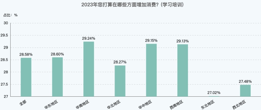 从不同区域来看,华南、华中和西南地区的年轻人。他们中有29%以上的人,今年准备在学习培训方面增加消费。
