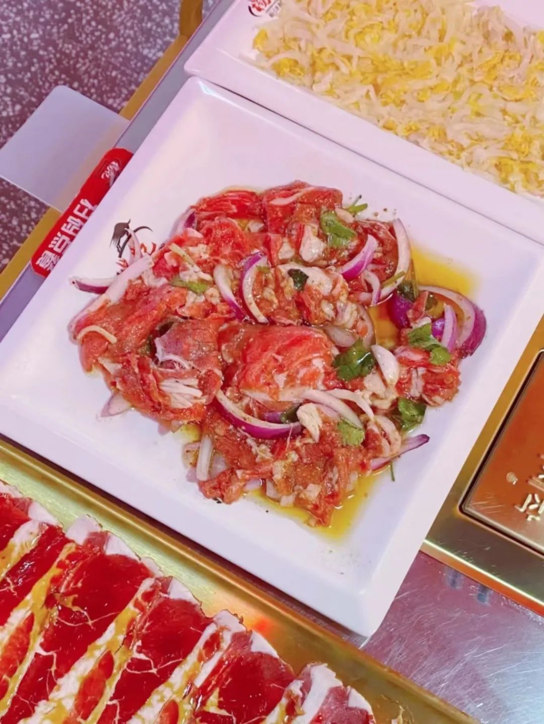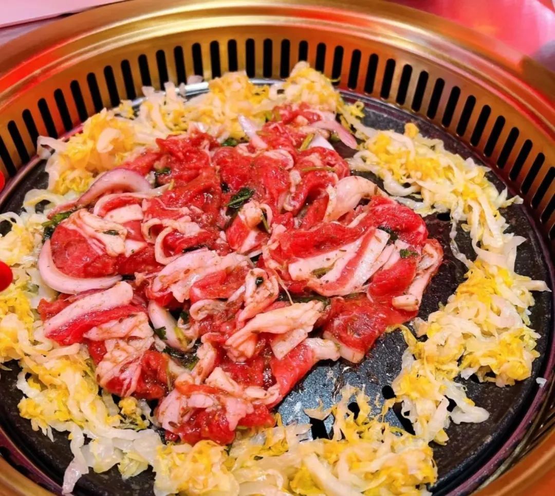 不论是炭烤鱿鱼、雪花牛肉粒,还是掌中宝、招牌肥牛,齐齐哈尔烤肉都是论盘上而非串烤,满满的一大盘端上桌,能摊满整个烤盘,分量十足!服务员会贴心地全程帮你烤肉,体现着草原人的豪气与爽气!