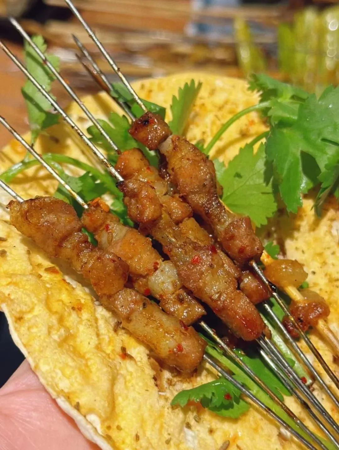 最新上线的隐藏版菜单——淄博小饼,是不必去挤啊挤,在撸啊撸就能吃到的淄博烧烤完美“平替”。刷好酱料,烤好上桌的小饼,还会配上香菜和小葱,手法流畅地裹进几串招牌铁签小肉,把铁签一把撸下来,留在饼里满满的全是肉!咬上一口超满足!