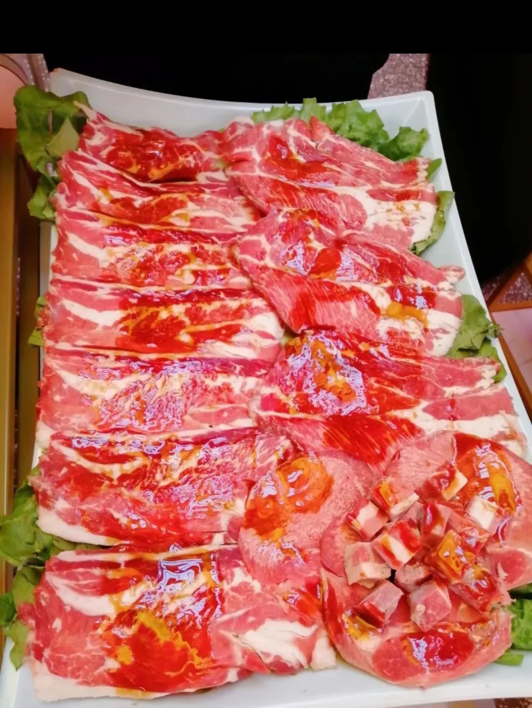 酸菜肥牛是杨记齐齐哈尔烤肉店的招牌,食材都是现切现拌。牛肉多选肋扇、上脑、胸口等部位,经过排酸处理,香而不膻,肥而不腻,有嚼劲而不柴,肉质非常鲜美。