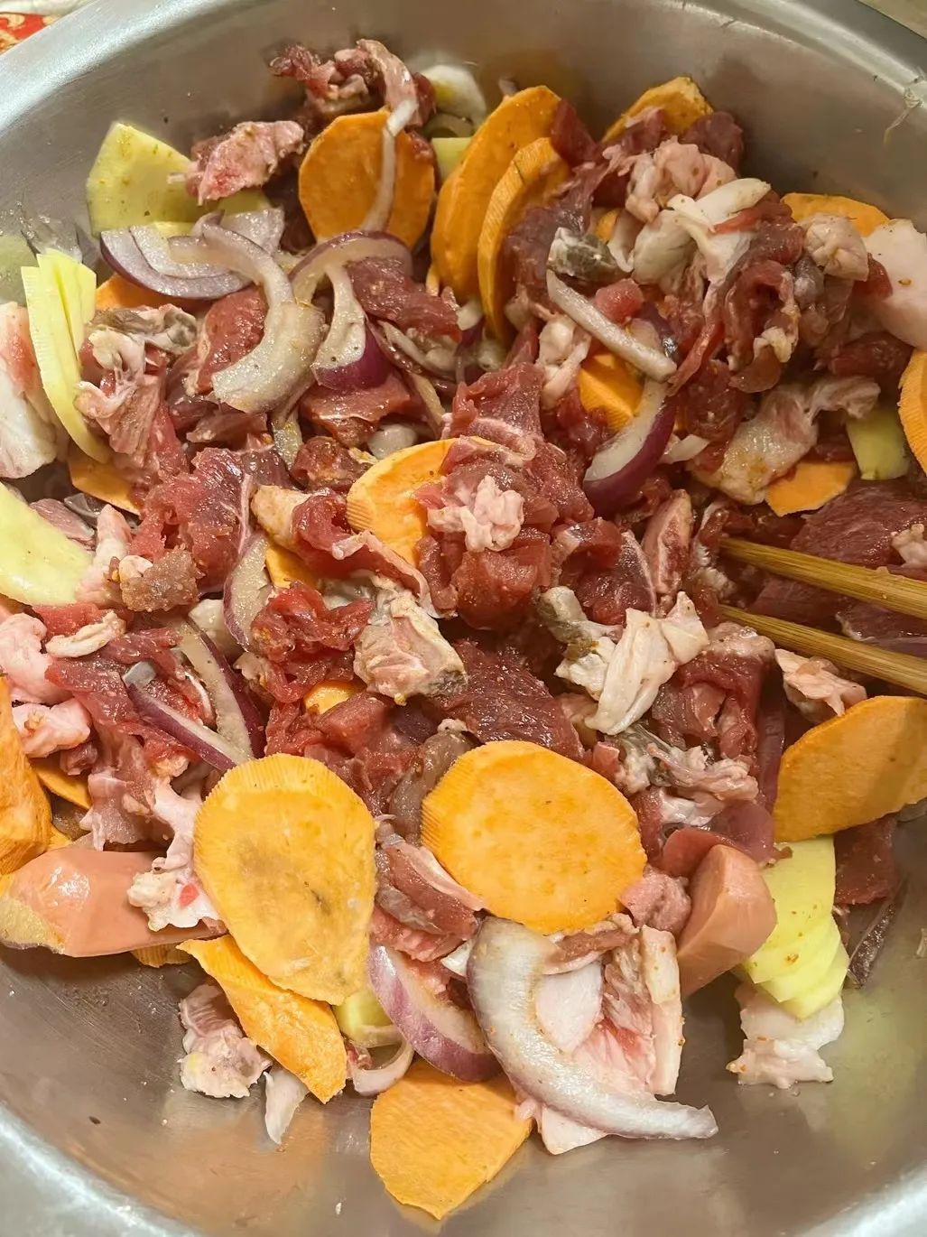 拌肉这一绝不能少的腌制工序是决定烤肉好不好吃的关键。洋葱去腥提鲜,加入大豆油和少量啤酒,让肉质变得更软嫩多汁,口感更丰腴,再把东北经典的酸菜拌进去,直接上手来次充分按摩,腌制入味后的牛肉不断向外释放着诱惑的香气。这些都是齐齐哈尔人烤肉的独有心得。