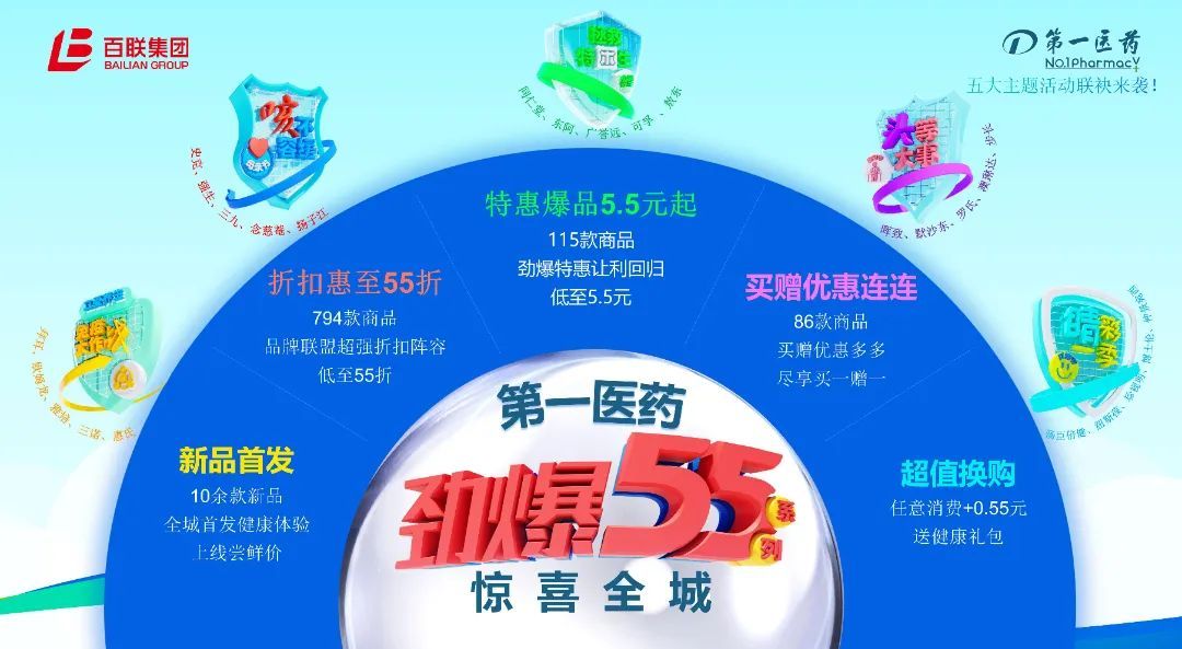 围绕五大健康主题,开展系列惠民活动,线上云课堂科普健康,线下千余款商品折扣促消费。百联20年,第一医药70年,感恩消费者,携手25家知名大牌,劲爆五五,惊喜全城,让利2000万。十余款新品全城首发,794款折扣商品惠至55折,115款特惠爆品5.5元起,86款商品买一送一,55场免费检测进社区,更有超值换购送健康。