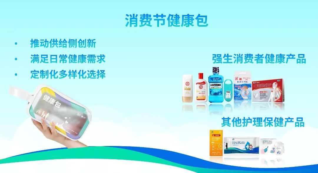 针对消费者的日常健康需求,打造定制化“健康包”,为大家带来李施德林、大宝、泰诺、美林、艾舒和邦廸等知名品牌,并结合日常消毒、护理和保健用品,通过供给侧创新,为消费者带来多样化的健康产品选择。