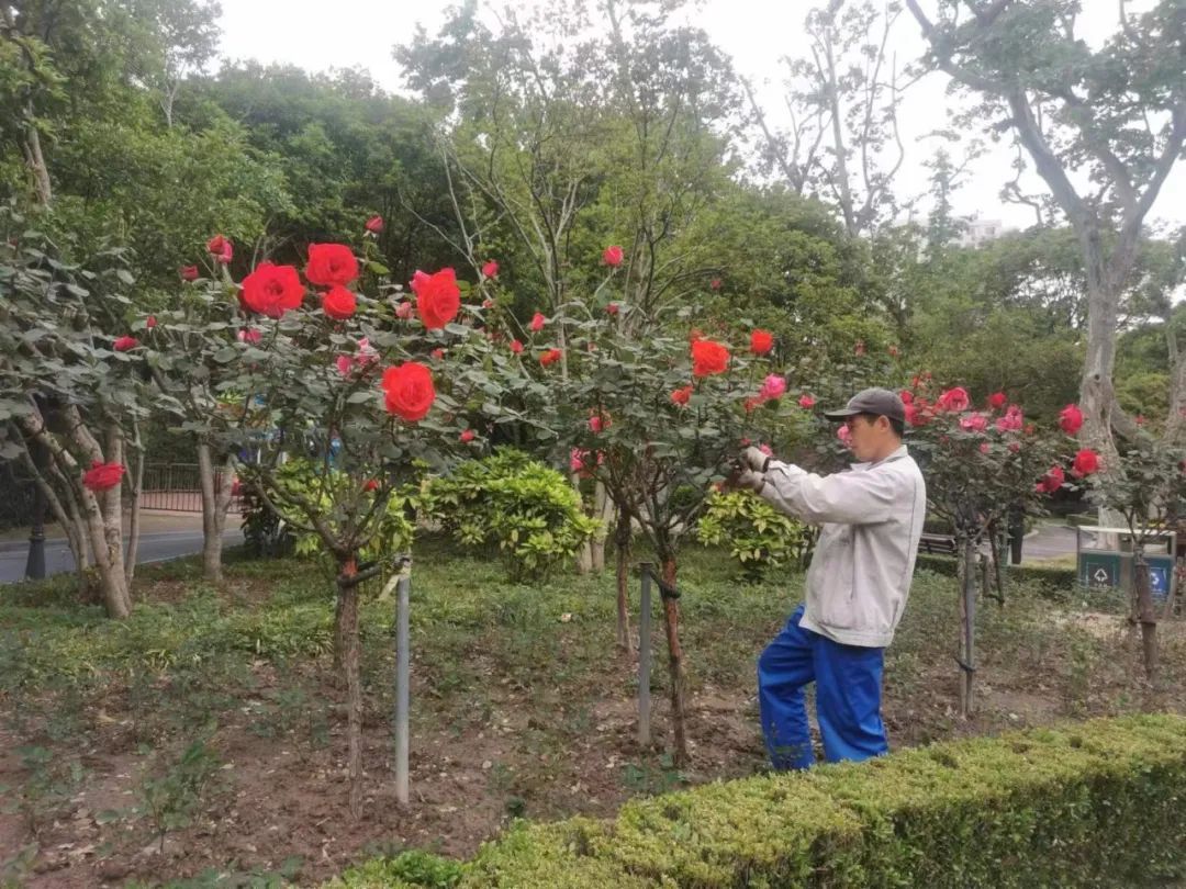 实际上,月季的养护并非易事,想要长势好又没有病虫害,背后需要下很多功夫。今年春天,鲁义兵和团队成员已经4次为月季花松土、施肥以及打药,精心的关照和养护才成就了这个春天月季园里“花圃吟红”的盛景。