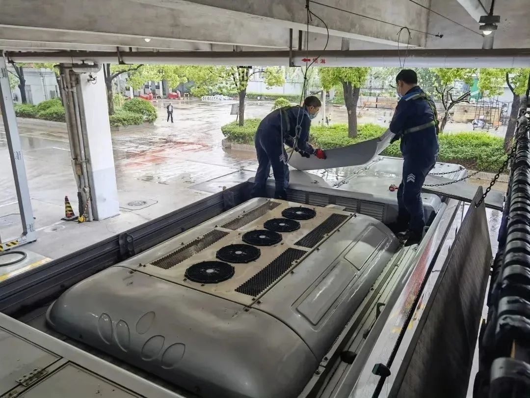 拆下滤网,喷洒消毒剂,再用水清洗,晾干后装上……这一套动作,在杨高公交的修理车间里不断进行着,考虑到未来梅雨、高温等天气因素对车辆的影响,此次检查还特别对各类新能源车辆的高低压电池、电池舱、电机、控制器、电动空压机、电动转向器、电空调、高压线束绝缘等项目进行了重点检查。