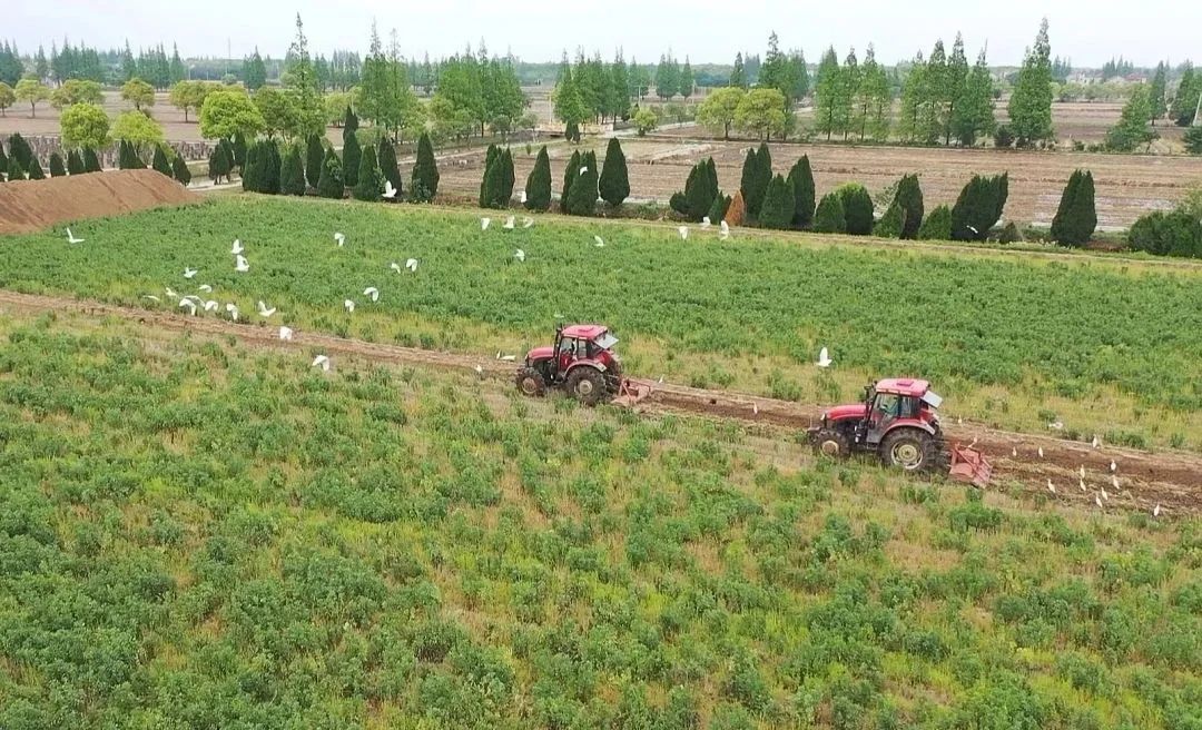 庙镇通济村崇明米业集团百农基地里,2台旋耕机正开足马力,来回翻耕作业。伴随着轰鸣的机器声,一亩亩长势喜人的蚕豆绿肥被翻耕、打碎后还田,为土壤注入肥力。农机驰骋翻耕、鸟儿追逐觅食,呈现一幅美丽图景。