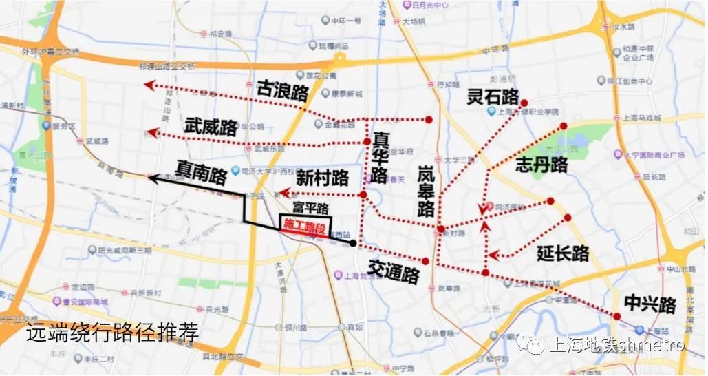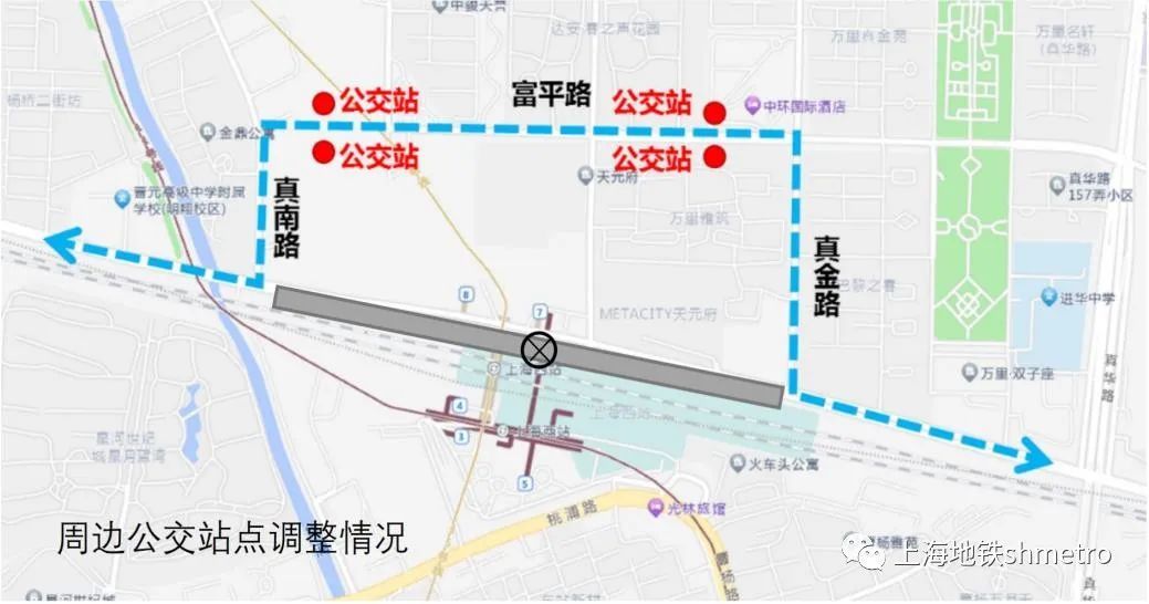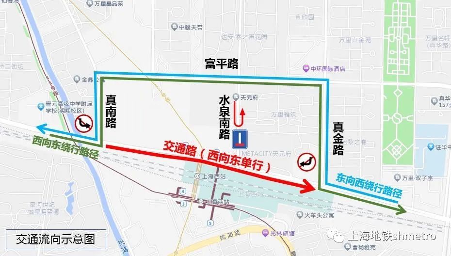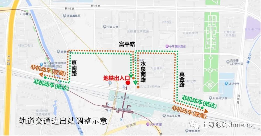 轨道交通11号线,15号线上海西站站出入口均保持现有进出站功能不变,乘客可沿交通路北侧人行道通过水泉南路人行通道进出地铁出入口;非机动车抵达和驶离地铁出入口均需从富平路绕行,请各位非机动车驾驶员根据现场道路指示牌有序通行。具体如下图所示。