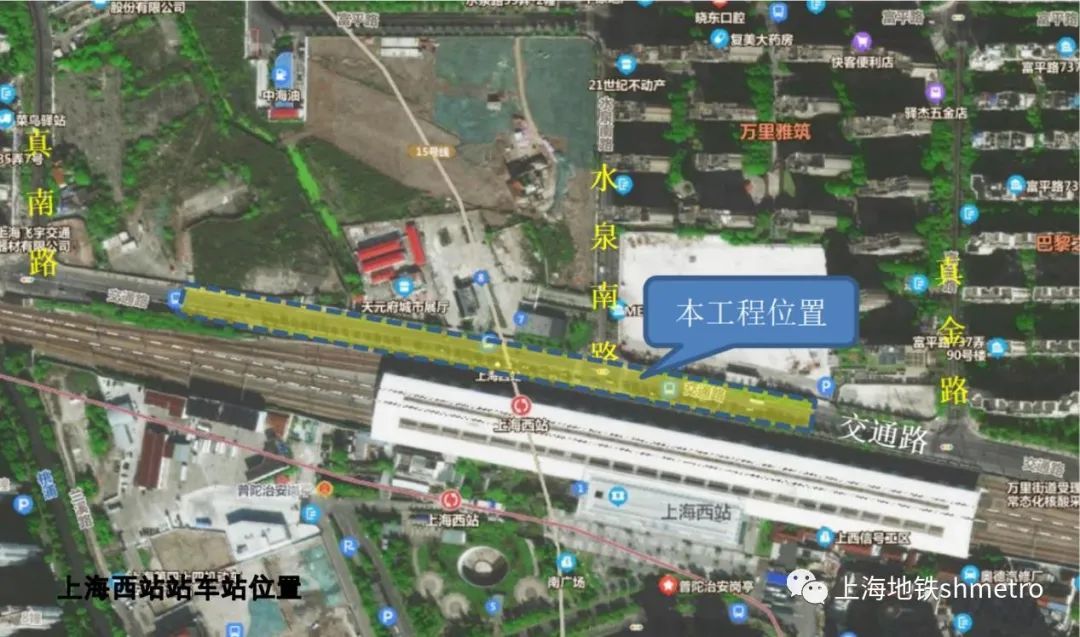 上海西站站长度约516米,沿交通路东西向布置,车站投影面积占用现状交通路大部分道路,地下二层岛式车站。车站紧邻的现状道路设施有真南路、水泉南路、真金路和富平路等。具体下如图所示。