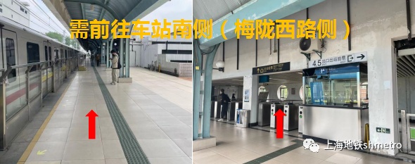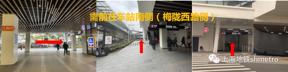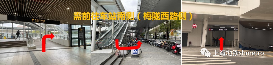 前往车站南侧(梅陇西路):请先经由1号口出站,通过天桥下楼至地面7号口,再由6A号口、6B号口出站。