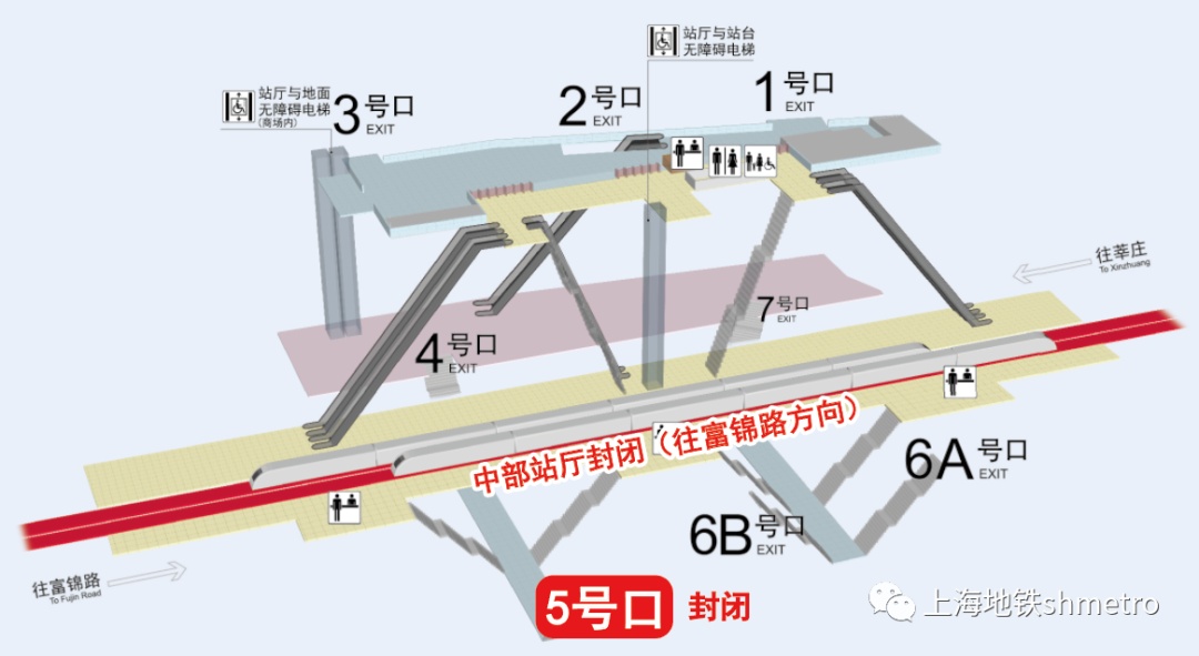 为配合上海轨道交通1号线莲花路站南侧站台改造施工项目,自2023年5月9日起,莲花路站5号口及局部站厅(往富锦路方向中部站厅)实施封闭,届时4、5号口取消过街通行功能。
