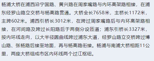 杨浦大桥为市区内环线重要组成部分,大桥建成后提高了苏州河以北地区越江通行能力,缓解了市中心交通拥塞的状况。