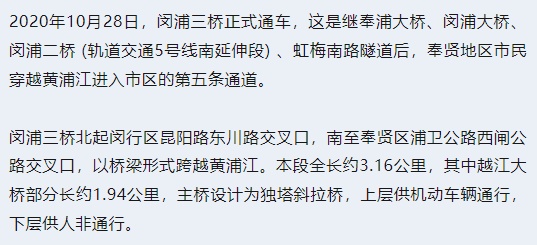 2010年4月20日,闵浦大桥通车运营,它位于奉浦大桥与徐浦大桥之间,是中国上海市境内连接闵行区与浦东新区的过江通道,为上海外环高速公路组成部分之一。