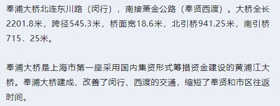 奉浦大桥位于闵行至西渡渡口下游1.5公里处,是沟通黄浦江中游两岸交通的纽带,1995年建成通车。
