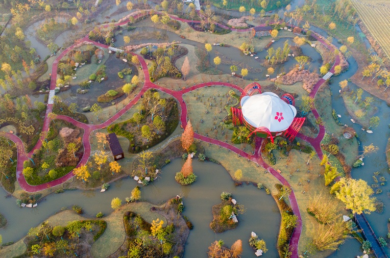 花博文化园总体规划秉承尊重自然肌理,保持生态基底和田园风貌的设计理念,围绕花博会“花开中国梦”的主题,全方位突出花元素、全力营造花文化氛围,积极运用生态环保新技术、新工艺,努力打造体现花博会特点、具有时代和区域特色的花博园。
