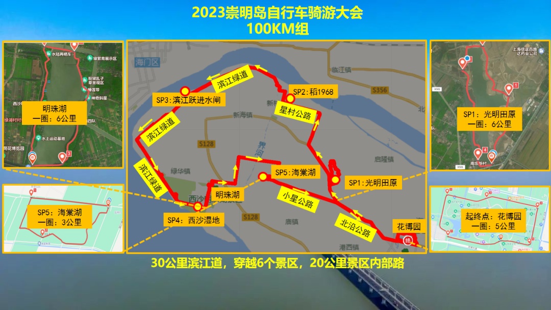 骑友们在崇明景区内部骑行赏景,约50公里景观路,其中滨江景观路约30公里,花博文化园内部路5公里,光明田原景区内部路6公里,西沙明珠湖景区内部路6公里,玉海棠景区内部路3公里。选手有充足时间在景区打卡拍照游览。