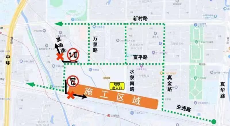 ◆交通路(真南路-真金路)西向东机动车道由2条车道调整为1条,容易发生交通拥堵,建议途经车辆可选择经真南路-富平路-真金路绕行。