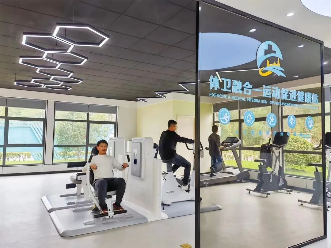虽然面积只有约100平方米,但这间小而美的“健身房”各类运动干预一体机一应俱全,设置了体重测试仪、反应时测试仪、坐位体前屈测试仪、俯卧撑测试仪等十几种体适能检测训练双功能设备,还有一套国民体质十一项测试器材,可对身高体重、体脂、力量、心肺功能、拉力、反应力等进行全面监测评估,自动生成测评报告,实现“一站式”健康服务、一体化干预。