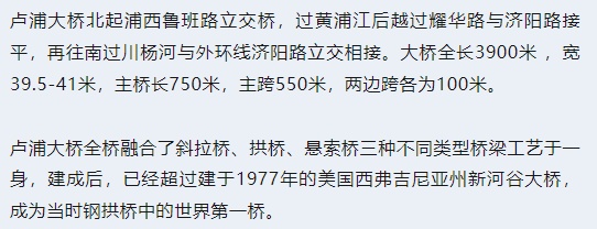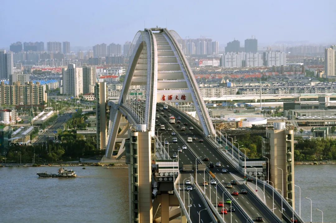 2003年6月28日,卢浦大桥建成通车,大桥结构类型为中承式拱桥,是世界上首座完全采用焊接工艺连接的大型拱桥。