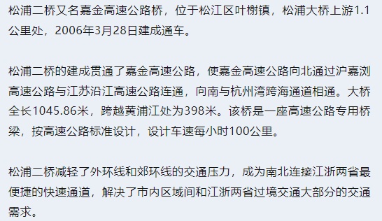 松浦三桥是松江区和金山区的重要交通枢纽,对充分发挥松卫公路整体交通功能、完善松江地区路网、分担过江交通量起到了积极作用。