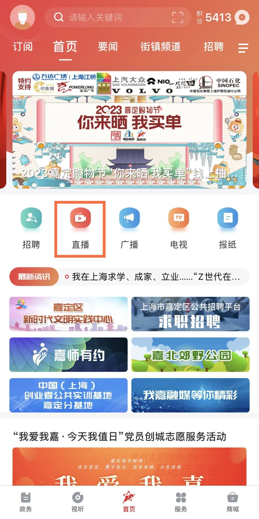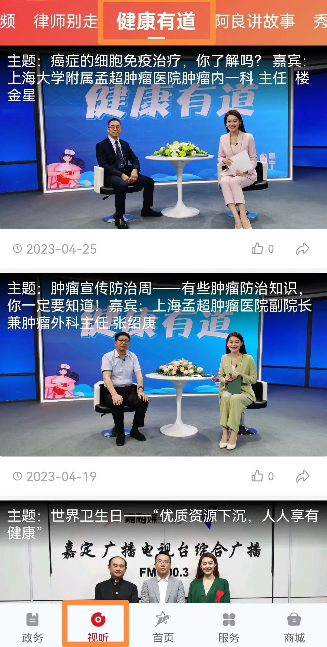 在“上海嘉定”APP首页中,点击“视听”按钮找到“健康有道”,可以回看往期节目。