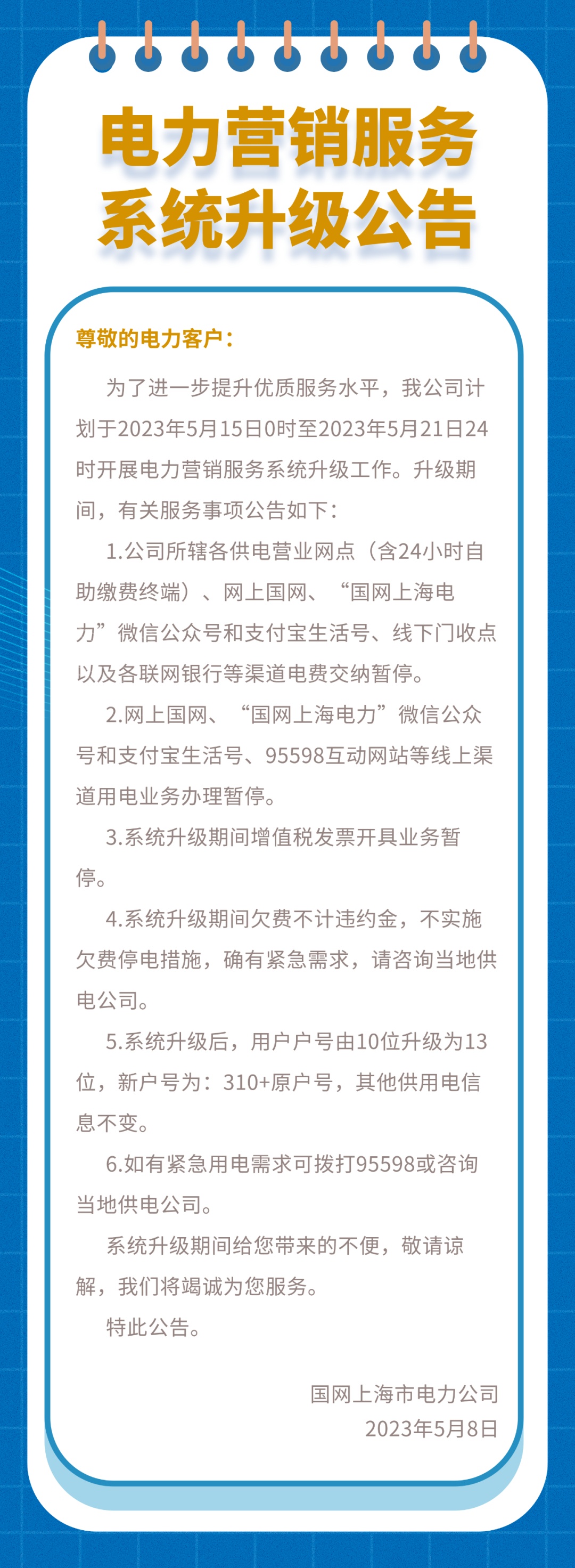 国网上海市电力公司介绍,为了进一步提升优质服务水平,计划于2023年5月15日0时至2023年5月21日24时开展电力营销服务系统升级工作。升级期间,电费交纳、线上渠道用电业务办理、增值税发票开具业务等服务事项将暂停。详见↓