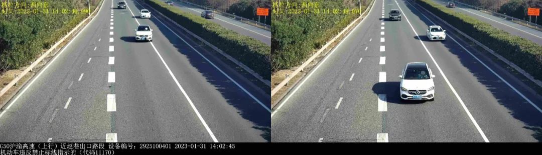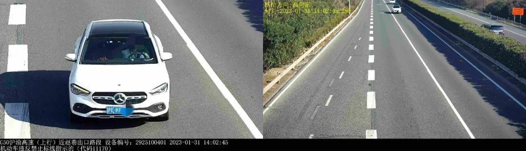 ▲2023年1月31日14时02分,号牌为沪EHF***的小型轿车在G50沪渝高速近赵巷出口路段,实施了“机动车违反禁止标线指示的”违法行为。