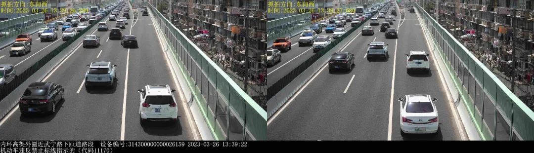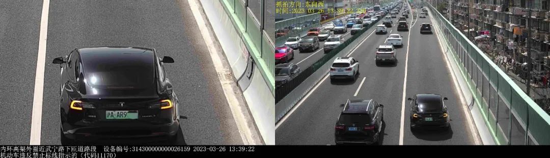 ▲2023年3月26日13时39分,号牌为沪AAR9***的小型轿车在内环高架外圈近武宁路下匝道路段,实施了“机动车违反禁止标线指示的”违法行为。