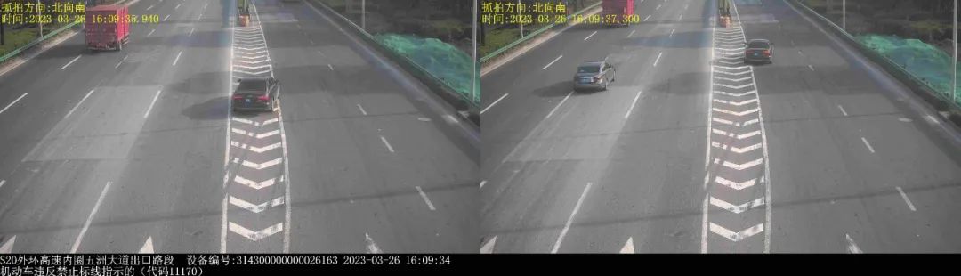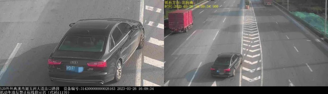 ▲2023年3月26日16时09分,号牌为沪DFN***的小型轿车在S20外环高速内圈五洲大道出口路段,实施了“机动车违反禁止标线指示的”违法行为。