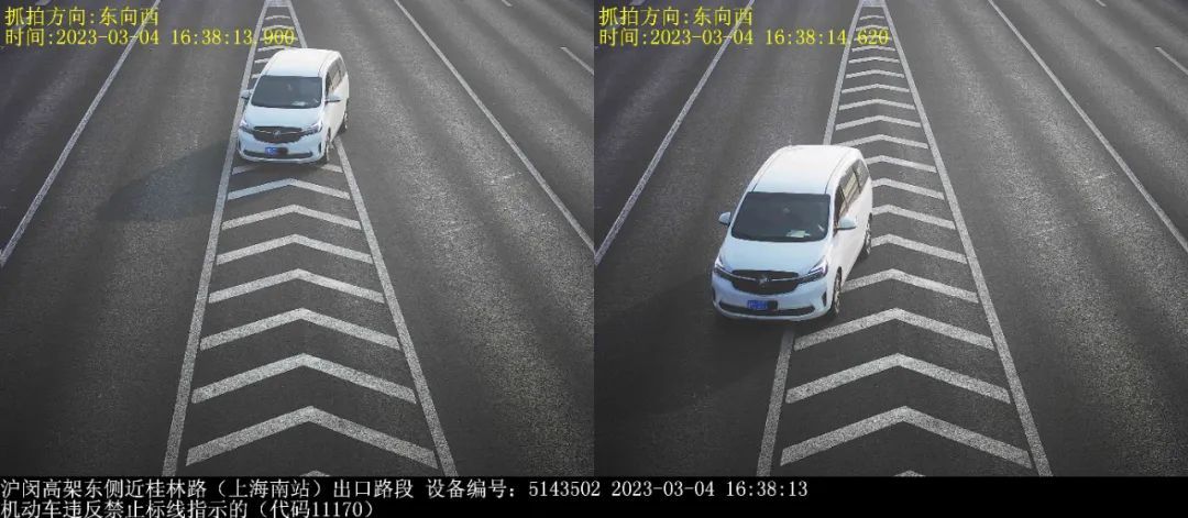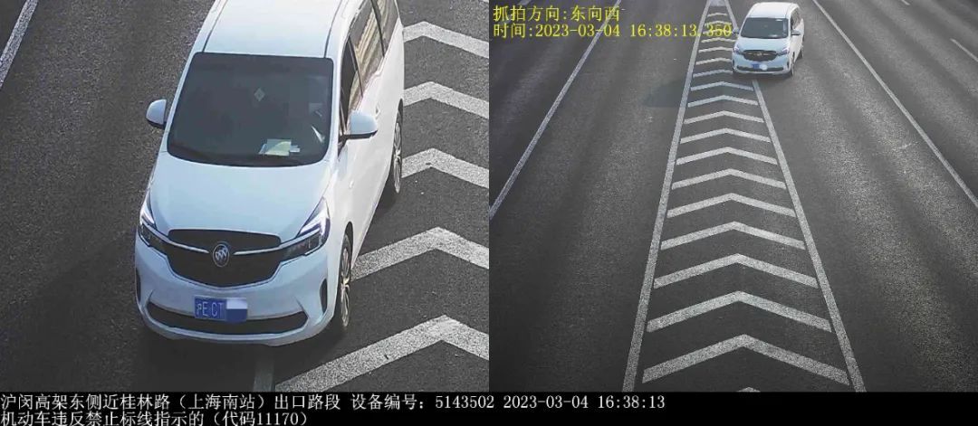 ▲2023年3月4日16时38分,号牌为沪ECT***的小型普通客车在沪闵高架东侧近桂林路出口路段,实施了“机动车违反禁止标线指示的”违法行为。