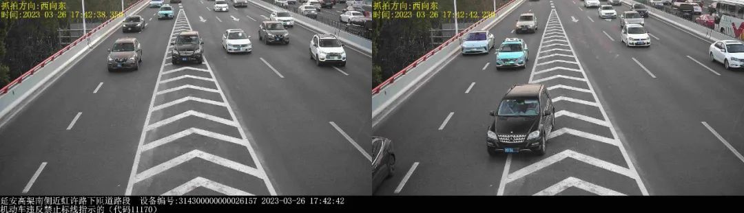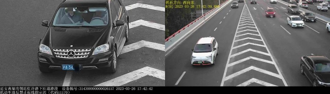 ▲2023年3月26日17时42分,号牌为沪A34***的小型越野客车在延安高架南侧近虹许路下匝道路段,实施了“机动车违反禁止标线指示的”违法行为。