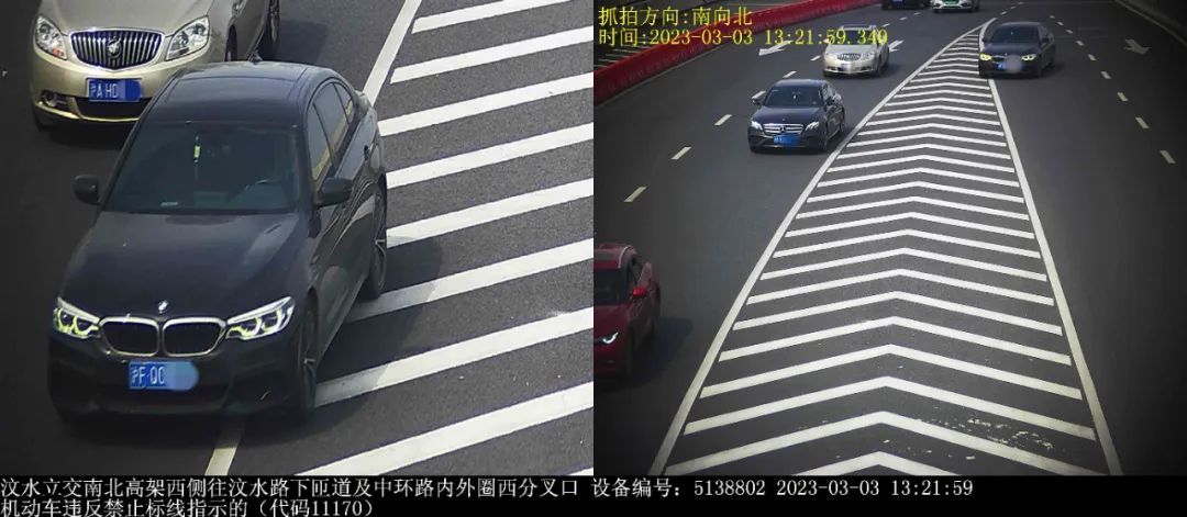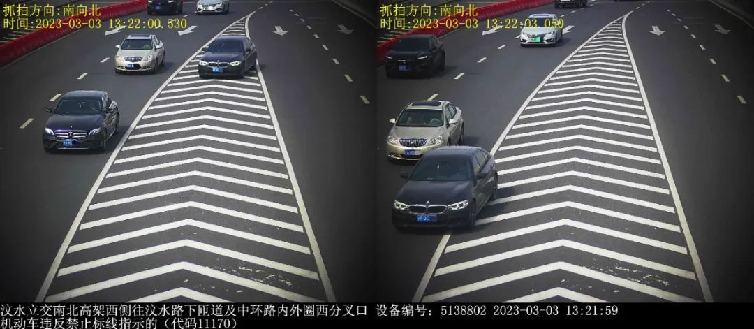 ▲2023年3月3日13时21分,号牌为沪FQC***的小型轿车在汶水立交南北高架西侧往汶水路下匝道,实施了“机动车违反禁止标线指示的”违法行为。