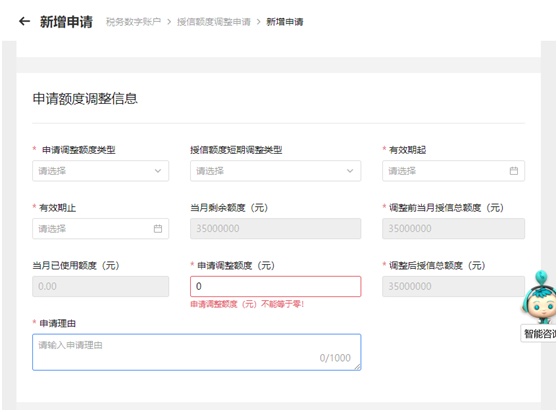 试点纳税人通过电子发票服务平台的“税务数字账户—授信额度调整申请”模块,申请调整总授信额度,填写调整理由并上传相关附件后,即可启动人工调整流程。
