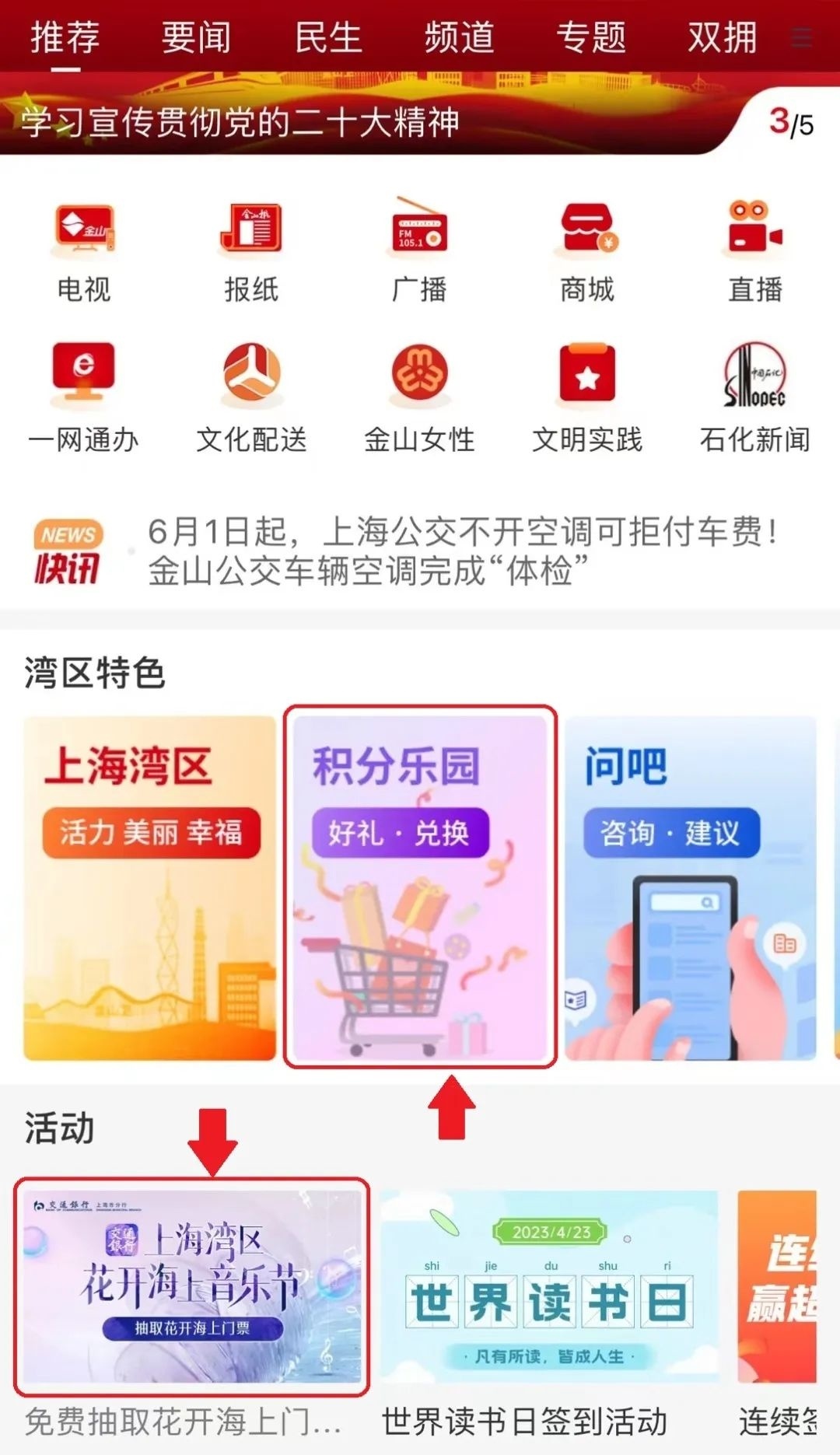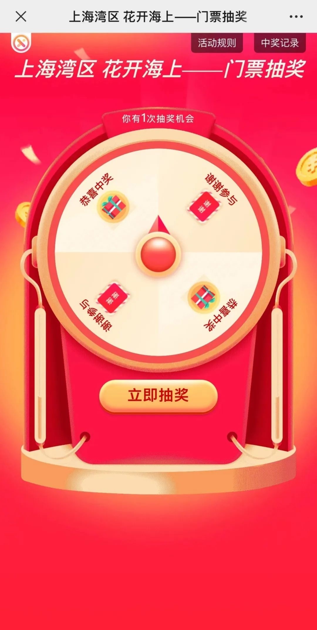 点击进入上海金山App首页积分乐园板块,参与积分夺宝,5月9日至18日期间,共进行2轮抽奖活动,奖品为花开海上生态园门票2张,共40份。