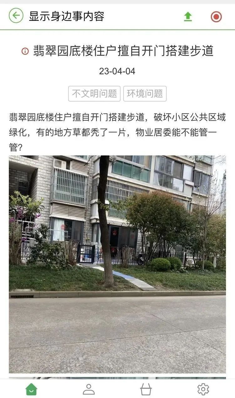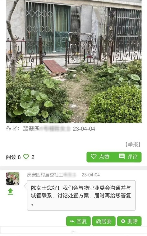 庆安四村社区中的新月翡翠园小区有多处底楼住户擅自将阳台围栏部分拆除改装,并出现占用公共绿带进行铺路的行为,不仅侵占社区公共区域,损害了其他业主的使用权益,也对小区整体文明创建形象造成了破坏,给社区管理带来难度。