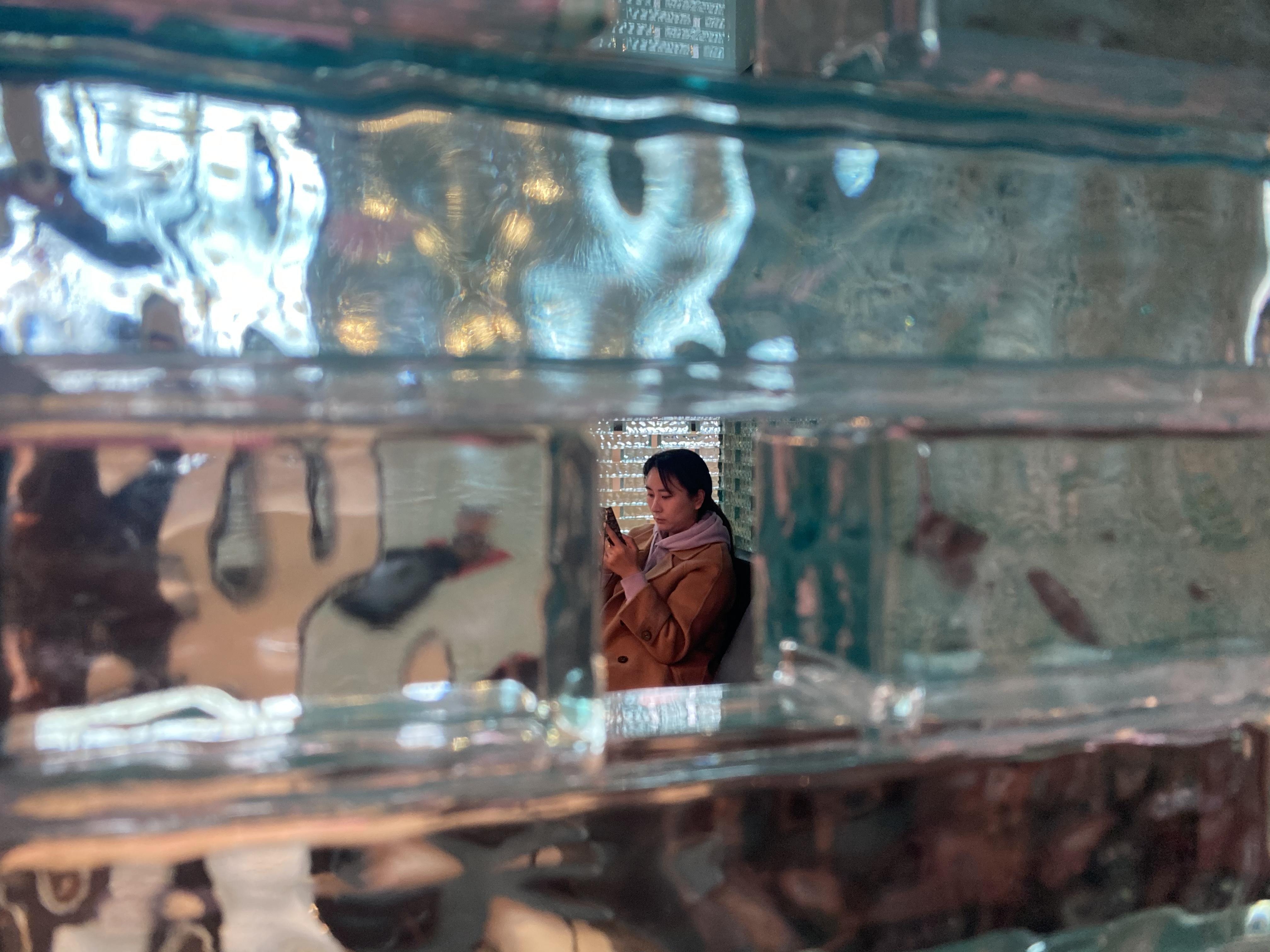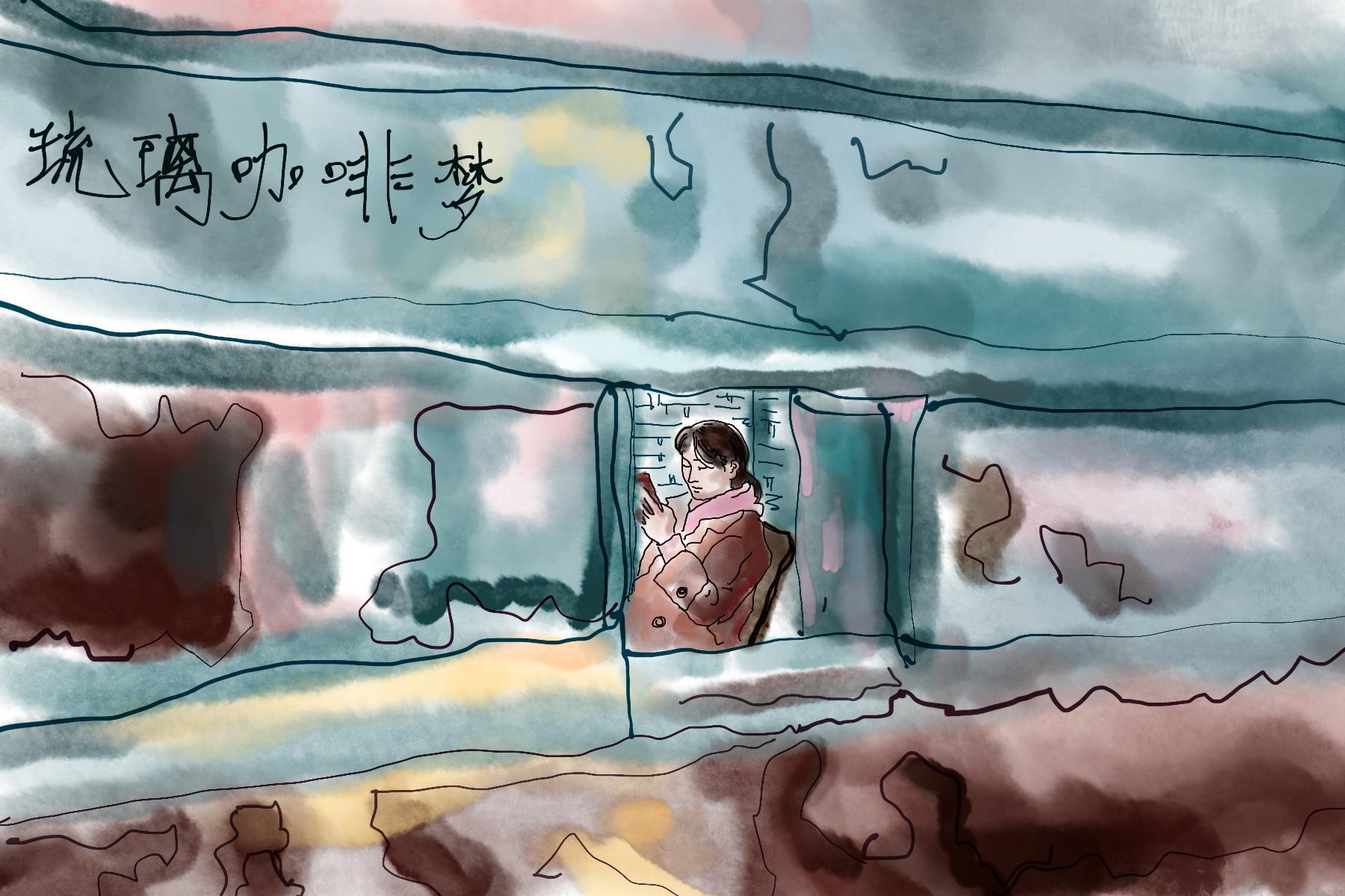 夜晚坐在蓝色玻璃房中的女孩,喝着咖啡手机键盘拇指不停。也许是在聊工作,也许和朋友说着八卦。